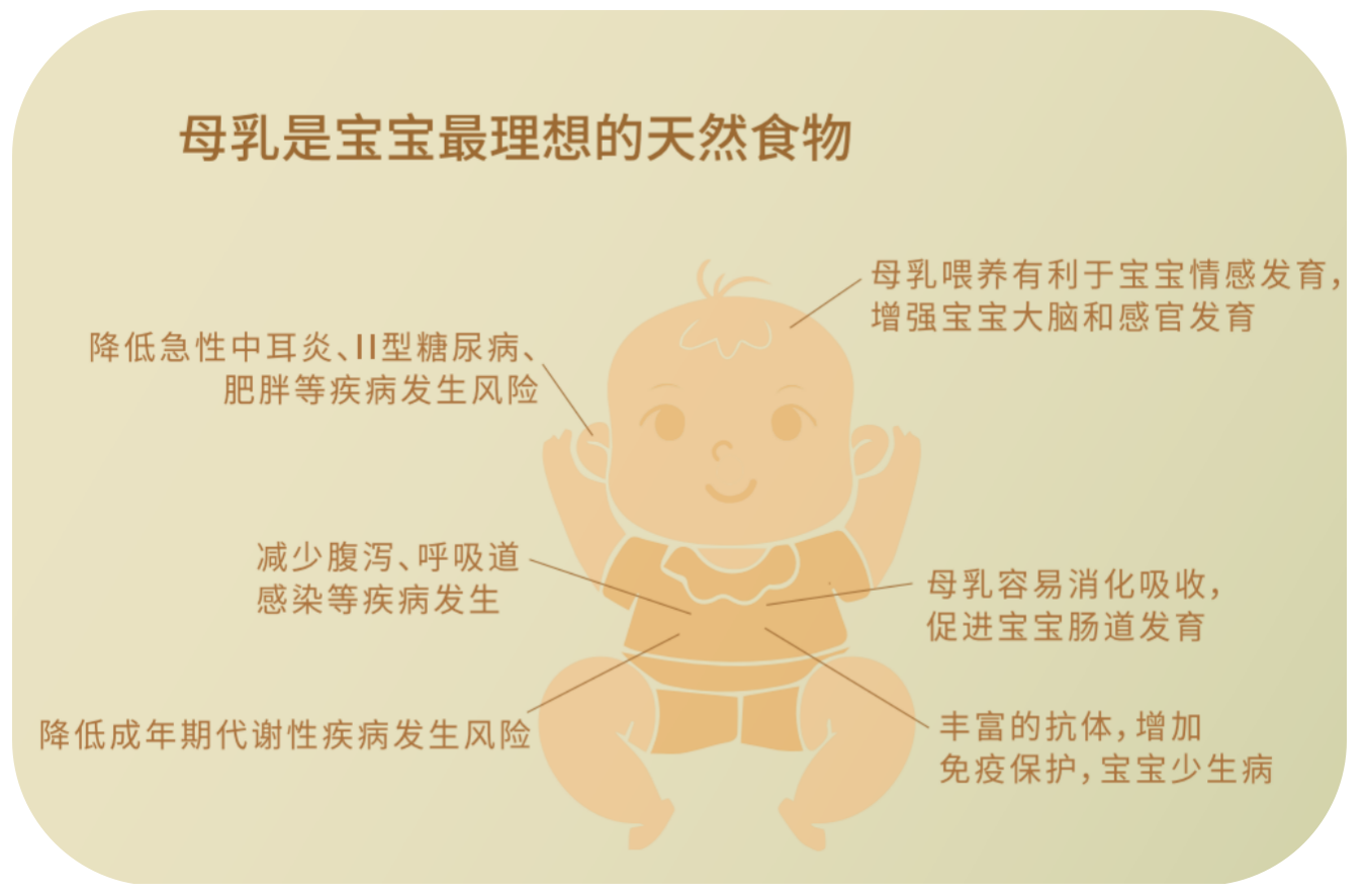 母乳喂养无需准备、加热和调配,非常便捷,是母婴家庭首选的、经济且环保的生活方式。即使遭遇自然灾害等危急时刻,母乳喂养也能确保婴儿的食品供应和安全。母乳喂养可以减少婴儿疾病及死亡,且对于成年期的健康也带来积极的影响,是改善个人和国家健康、社会和经济发展的最佳投资之一。